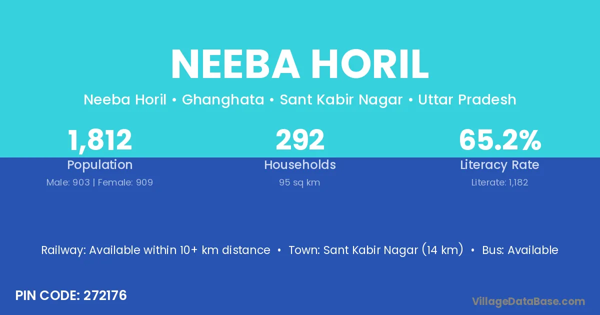 Sant Kabir Nagar (14 km) is the nearest town to Neeba Horil village for major economic activities and is located approximately 14 km away.