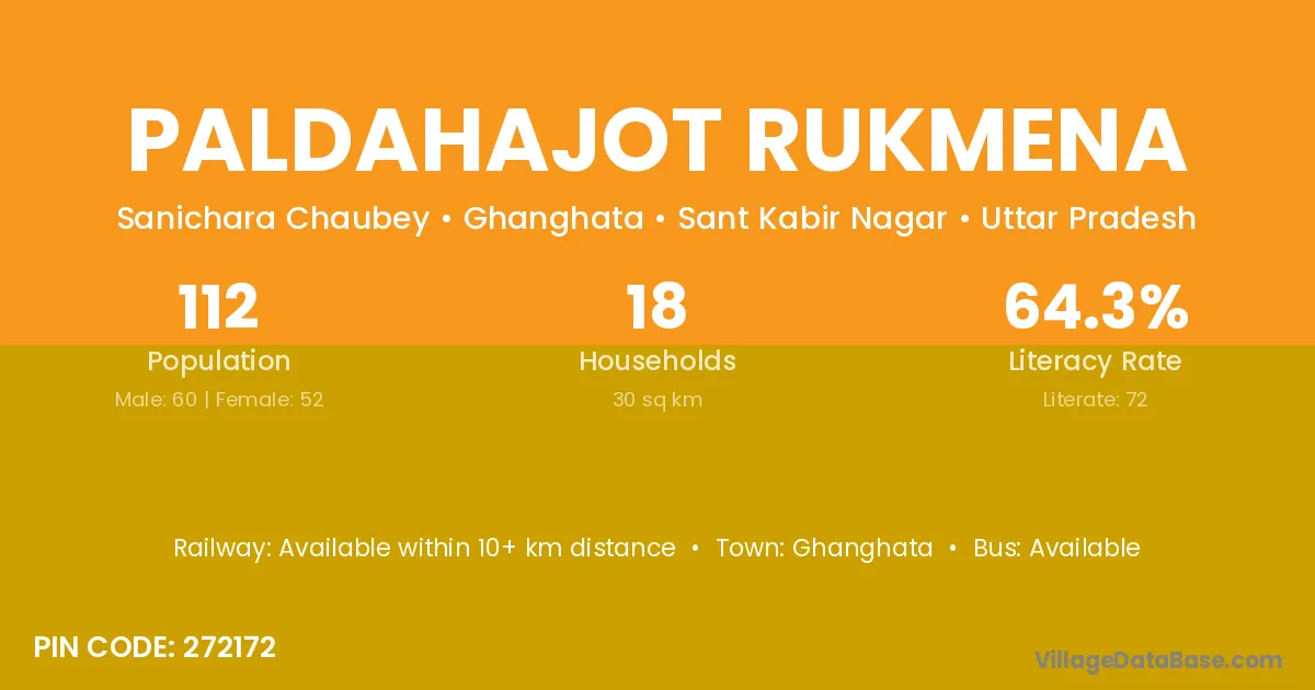 Paldahajot Rukmena village has a total population of 112 people, of which 60 are males and 52 are females.