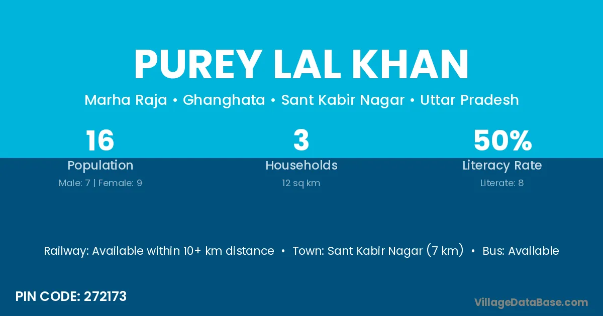 Sant Kabir Nagar (7 km) is the nearest town to Purey Lal Khan village for major economic activities and is located approximately 7 km away.