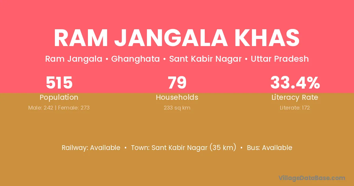 Sant Kabir Nagar (35 km) is the nearest town to Ram Jangala Khas village for major economic activities and is located approximately 35 km away.