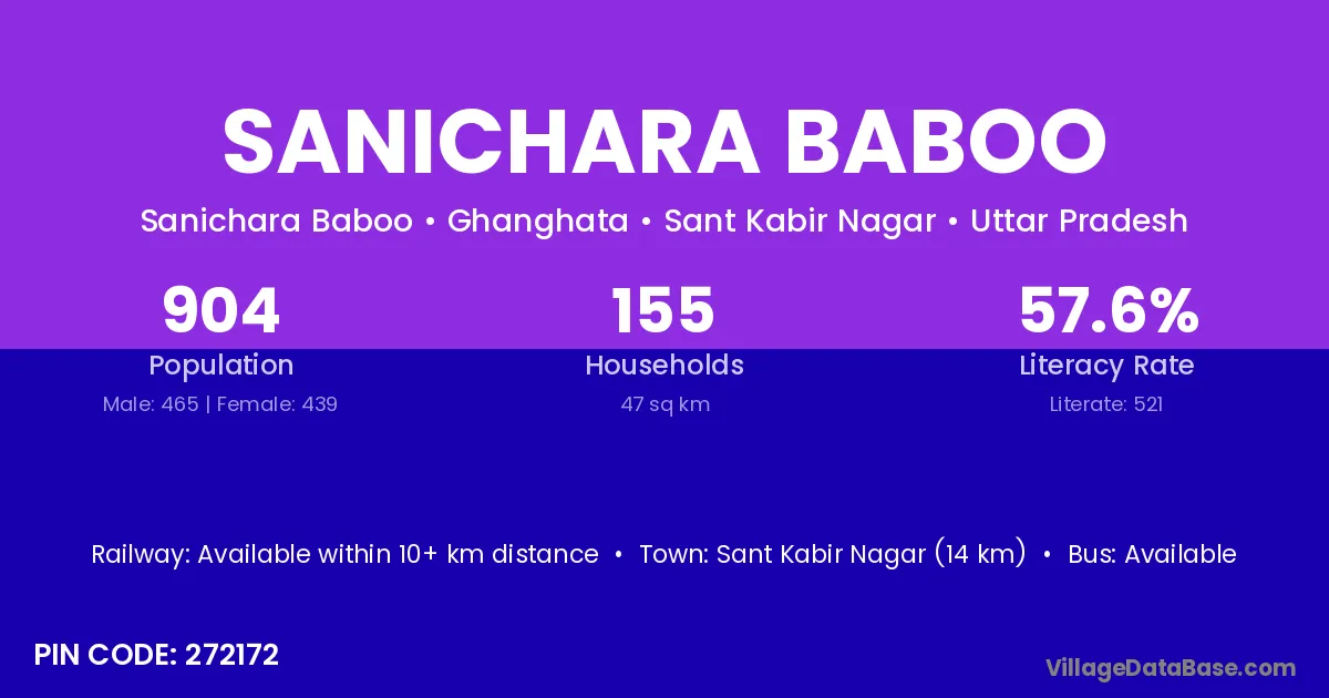 Sant Kabir Nagar (14 km) is the nearest town to Sanichara Baboo village for major economic activities and is located approximately 14 km away.