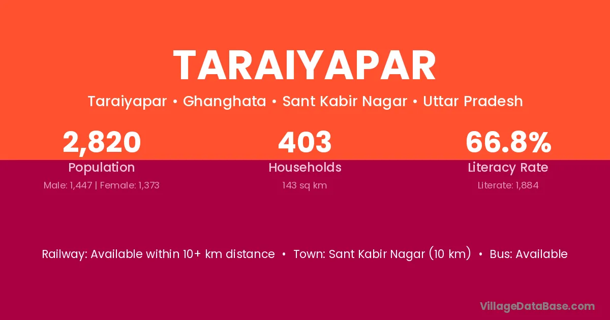 Sant Kabir Nagar (10 km) is the nearest town to Taraiyapar village for major economic activities and is located approximately 10 km away.
