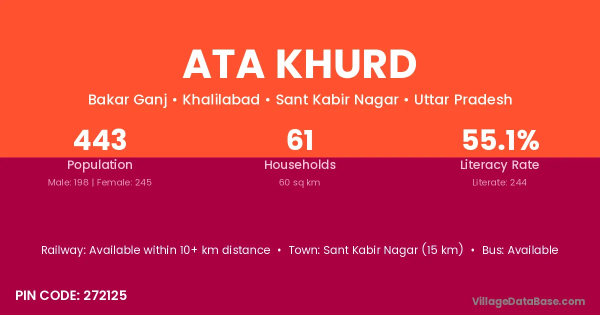 Sant Kabir Nagar (15 km) is the nearest town to Ata Khurd village for major economic activities and is located approximately 15 km away.