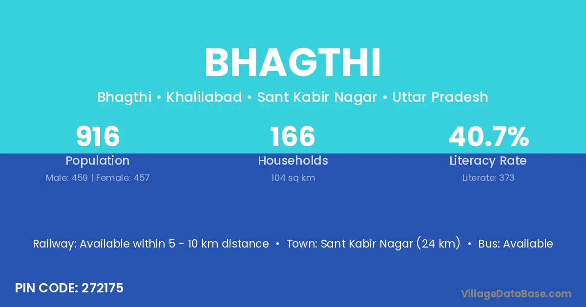 Sant Kabir Nagar (24 km) is the nearest town to Bhagthi village for major economic activities and is located approximately 24 km away.