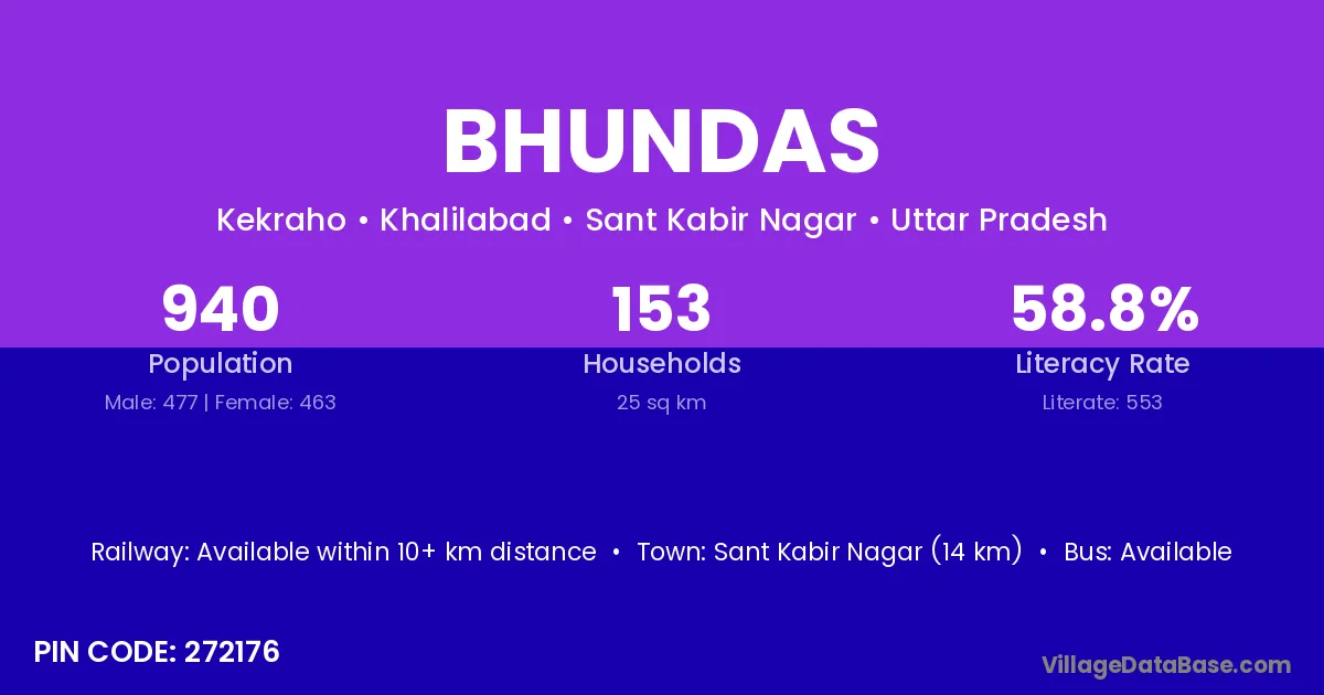 Sant Kabir Nagar (14 km) is the nearest town to Bhundas village for major economic activities and is located approximately 14 km away.