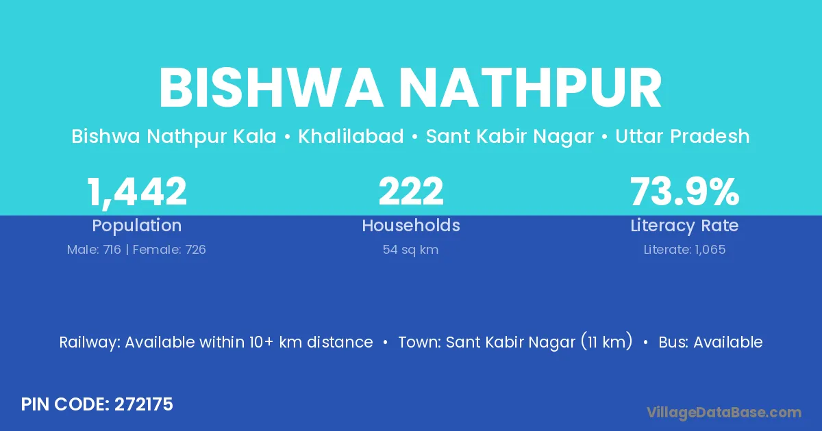 Sant Kabir Nagar (11 km) is the nearest town to Bishwa Nathpur village for major economic activities and is located approximately 11 km away.