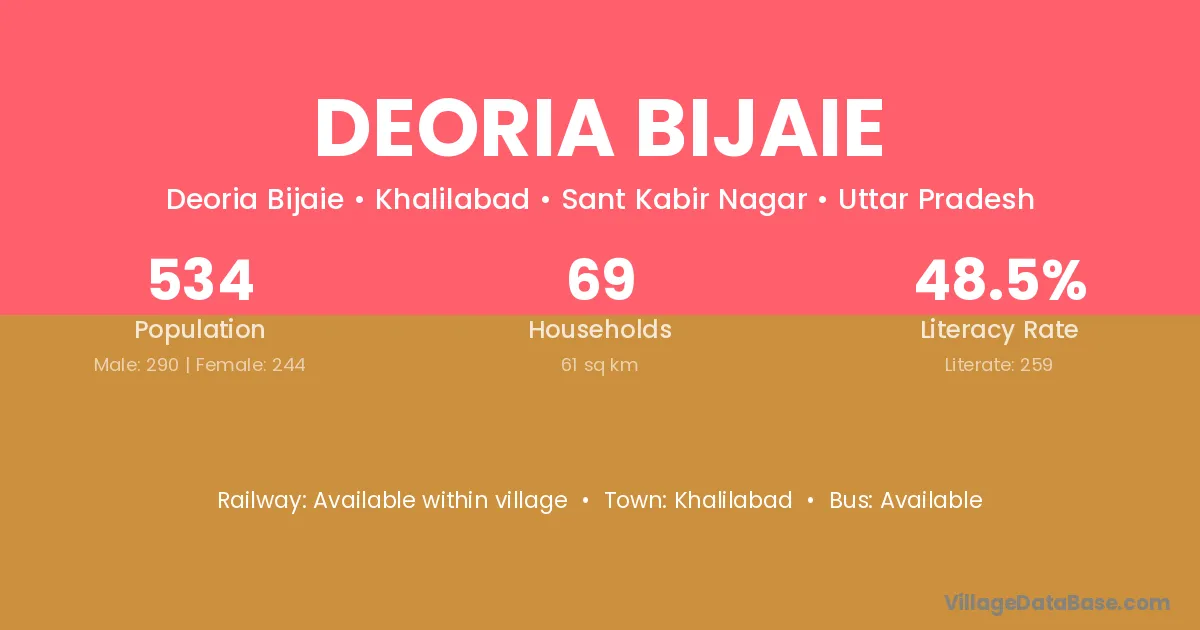 Deoria Bijaie village has a total population of 534 people, of which 290 are males and 244 are females.