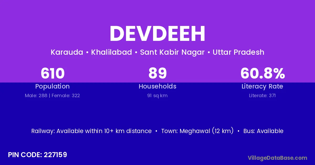 The literacy rate of Devdeeh village is 60.82%. Male literacy stands at 71.18% and female literacy at 51.55%.