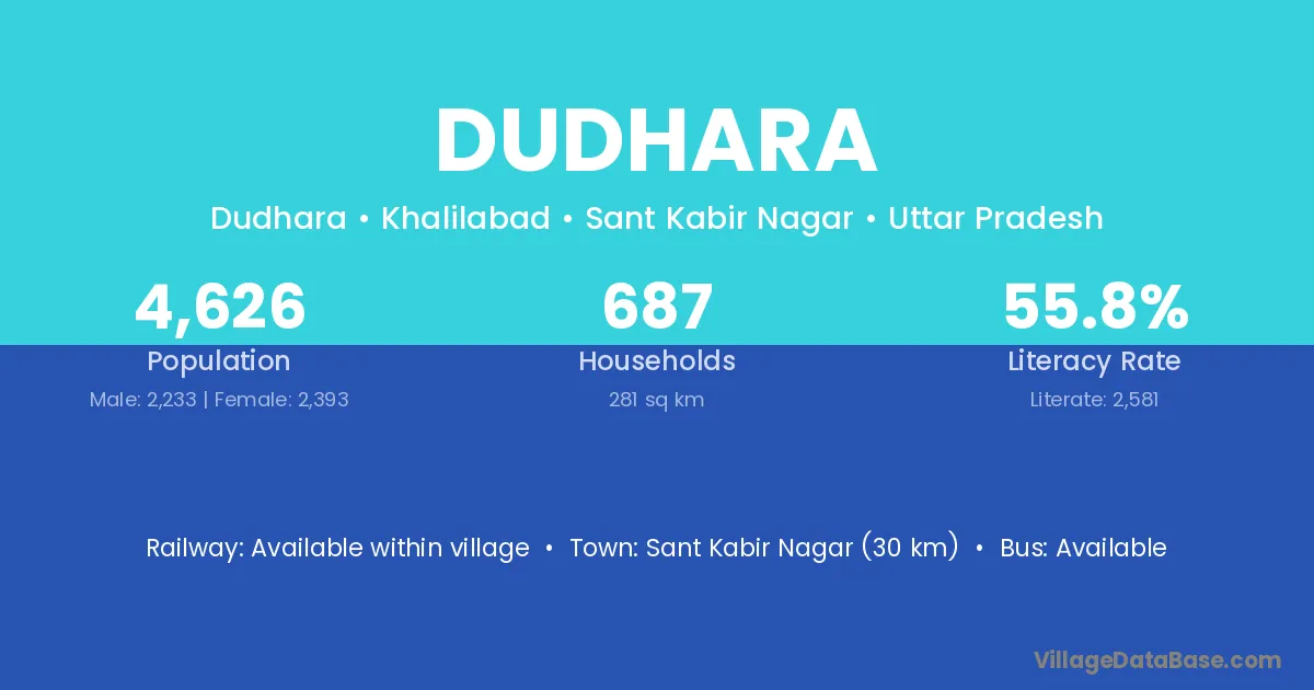 Sant Kabir Nagar (30 km) is the nearest town to Dudhara village for major economic activities and is located approximately 30 km away.