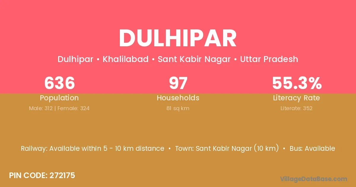 Sant Kabir Nagar (10 km) is the nearest town to Dulhipar village for major economic activities and is located approximately 10 km away.