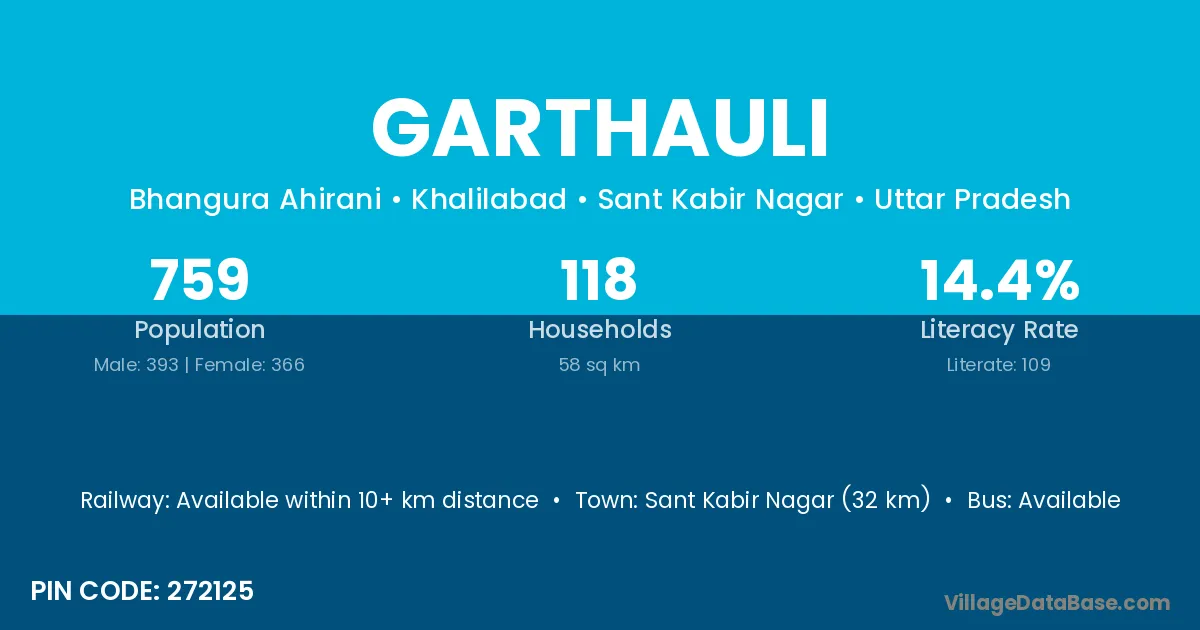 Sant Kabir Nagar (32 km) is the nearest town to Garthauli village for major economic activities and is located approximately 32 km away.