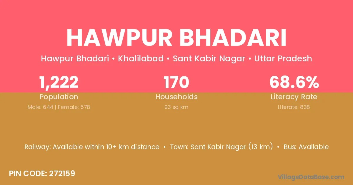 Sant Kabir Nagar (13 km) is the nearest town to Hawpur Bhadari village for major economic activities and is located approximately 13 km away.