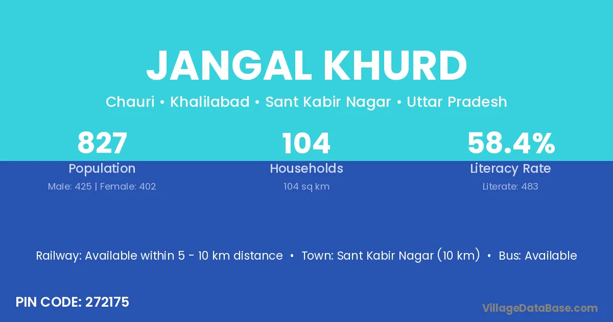 Sant Kabir Nagar (10 km) is the nearest town to Jangal Khurd village for major economic activities and is located approximately 10 km away.