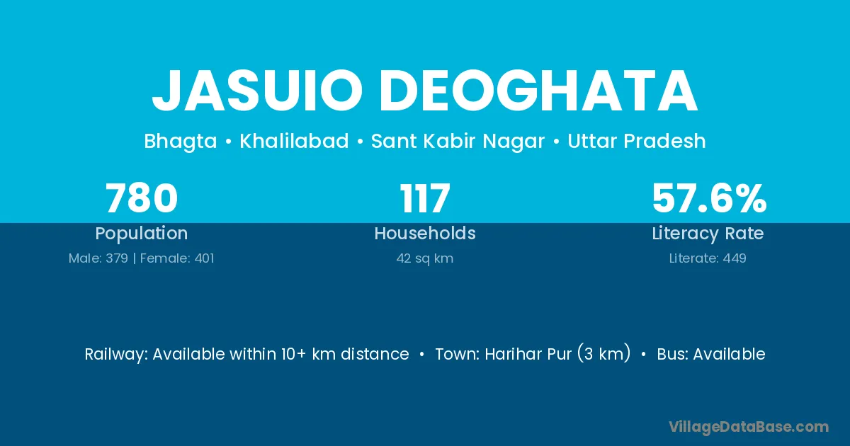 Jasuio Deoghata village has a total population of 780 people, of which 379 are males and 401 are females.