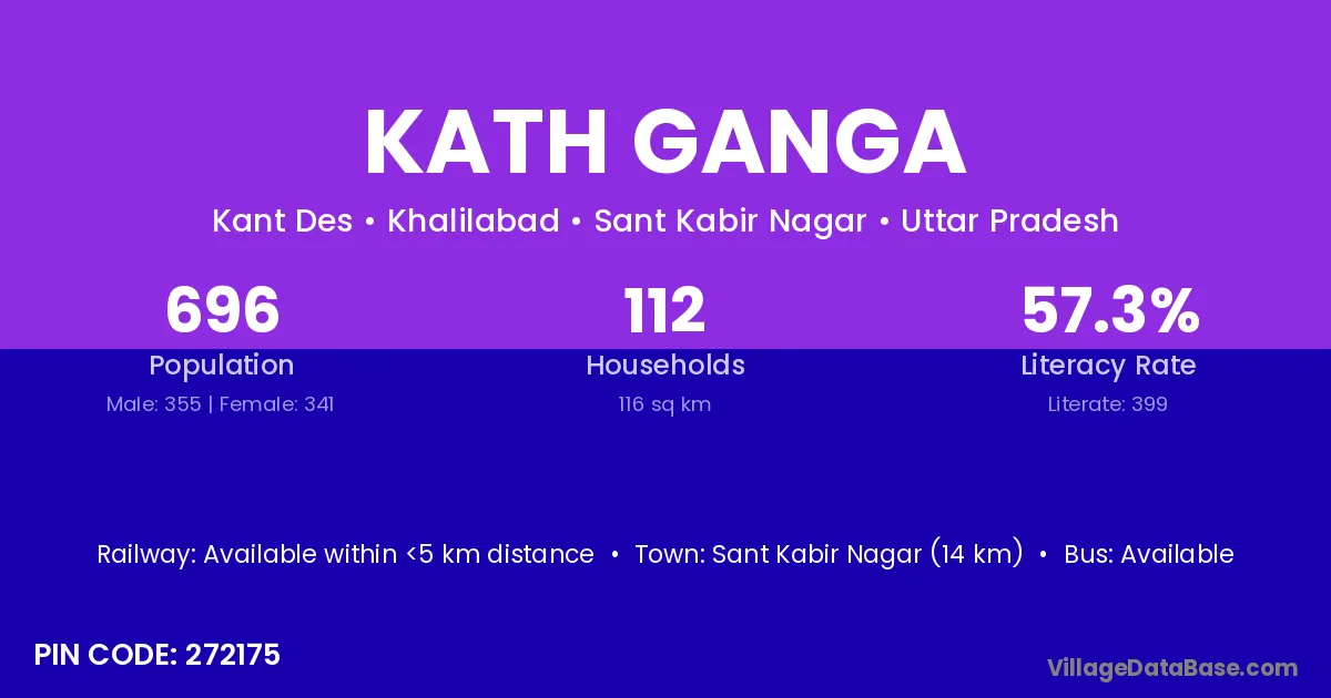 Sant Kabir Nagar (14 km) is the nearest town to Kath Ganga village for major economic activities and is located approximately 14 km away.