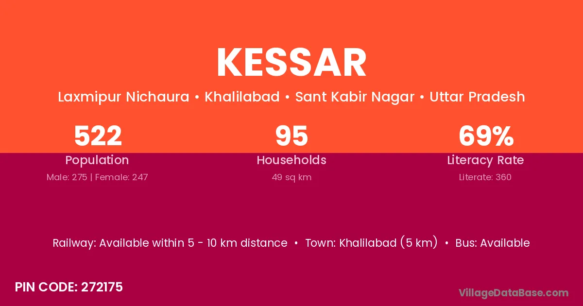 Khalilabad (5 km) is the nearest town to Kessar village for major economic activities and is located approximately 5 km away.