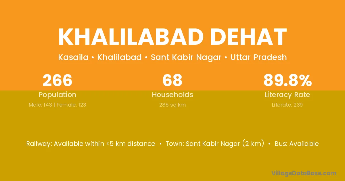 Sant Kabir Nagar (2 km) is the nearest town to Khalilabad Dehat village for major economic activities and is located approximately 2 km away.
