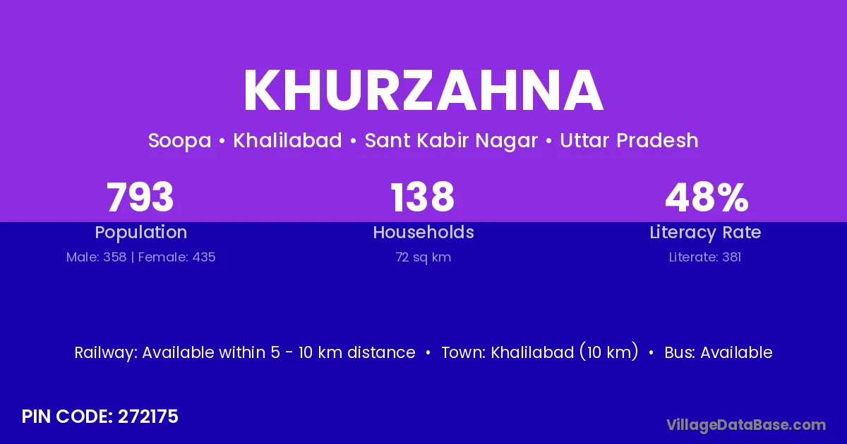 Khalilabad (10 km) is the nearest town to Khurzahna village for major economic activities and is located approximately 10 km away.