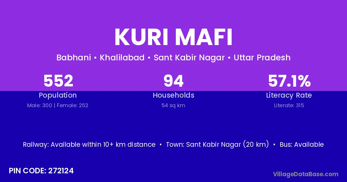 Sant Kabir Nagar (20 km) is the nearest town to Kuri Mafi village for major economic activities and is located approximately 20 km away.