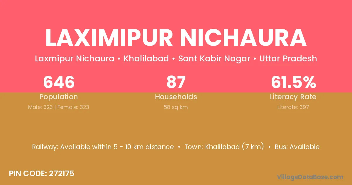Khalilabad (7 km) is the nearest town to Laximipur Nichaura village for major economic activities and is located approximately 7 km away.