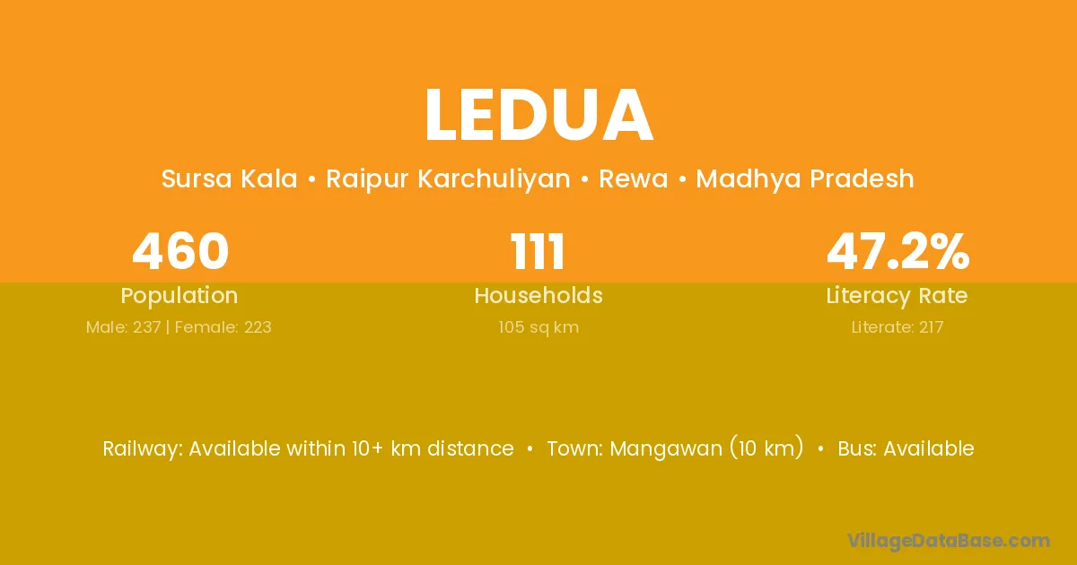 The literacy rate of Ledua village is 53.61%. Male literacy stands at 61.25% and female literacy at 46.08%.