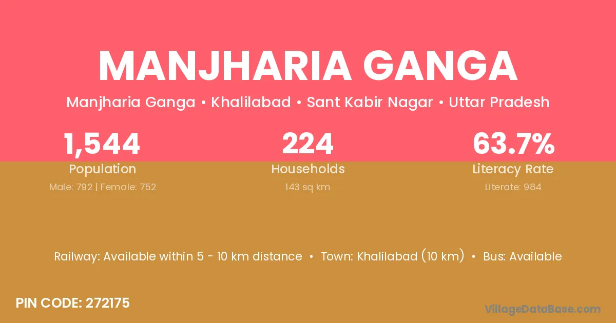 Khalilabad (10 km) is the nearest town to Manjharia Ganga village for major economic activities and is located approximately 10 km away.