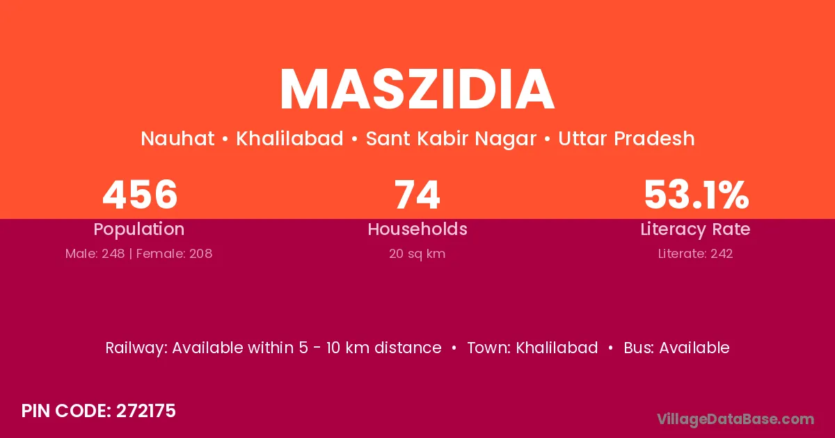 The literacy rate of Maszidia village is 53.07%. Male literacy stands at 62.10% and female literacy at 42.31%.