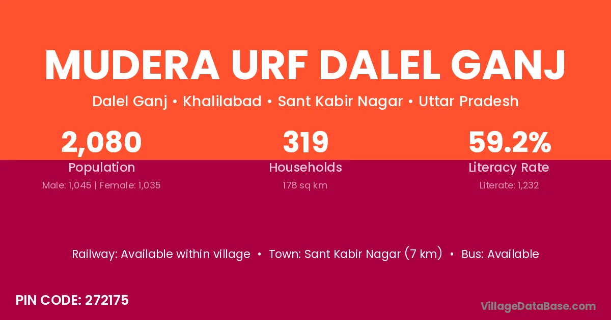 Sant Kabir Nagar (7 km) is the nearest town to Mudera Urf Dalel Ganj village for major economic activities and is located approximately 7 km away.