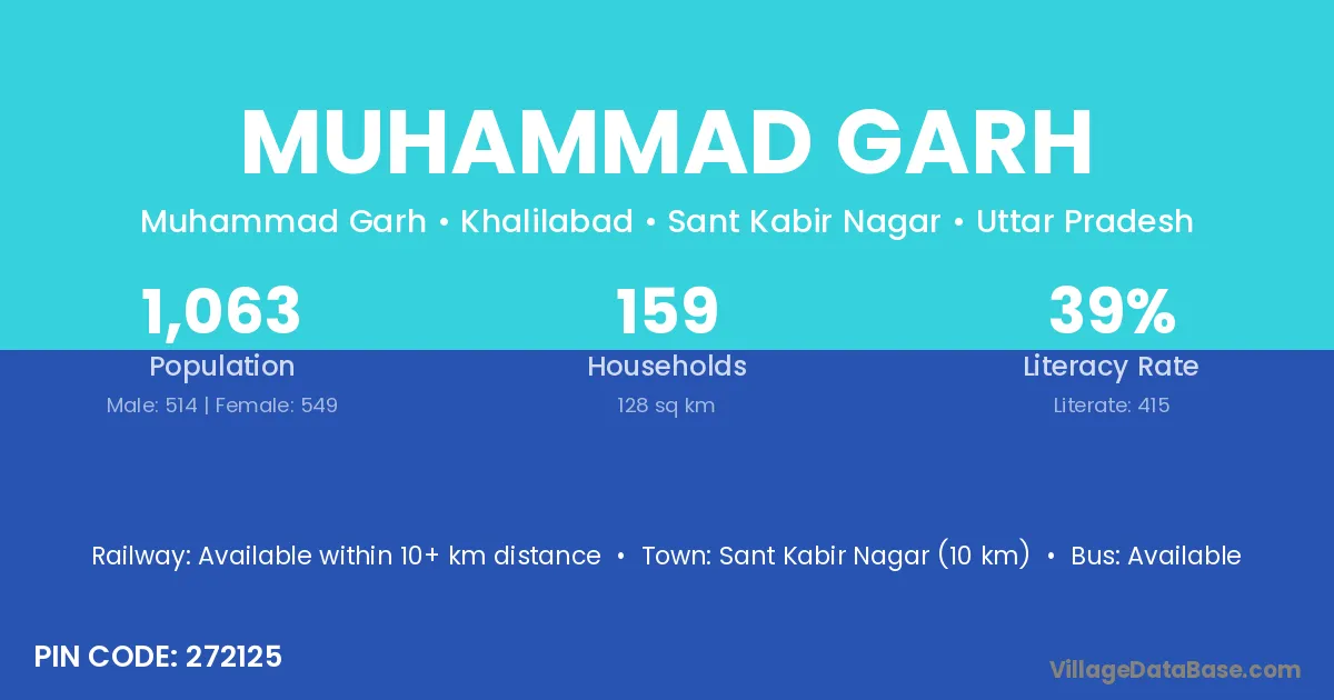 Sant Kabir Nagar (10 km) is the nearest town to Muhammad Garh village for major economic activities and is located approximately 10 km away.