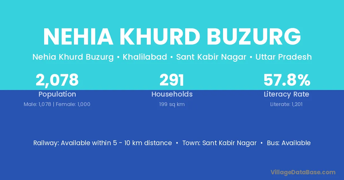 Nehia Khurd Buzurg village has a total population of 2,078 people, of which 1,078 are males and 1,000 are females.