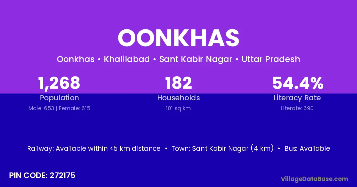 Sant Kabir Nagar (4 km) is the nearest town to Oonkhas village for major economic activities and is located approximately 4 km away.