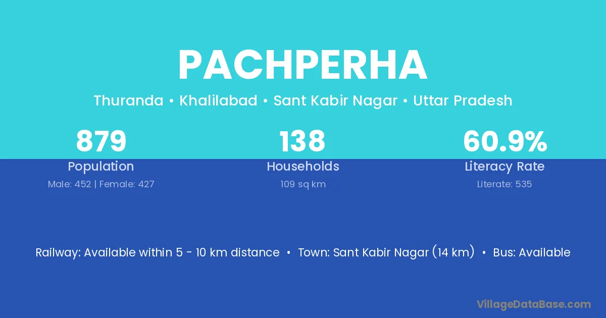 Sant Kabir Nagar (14 km) is the nearest town to Pachperha village for major economic activities and is located approximately 14 km away.