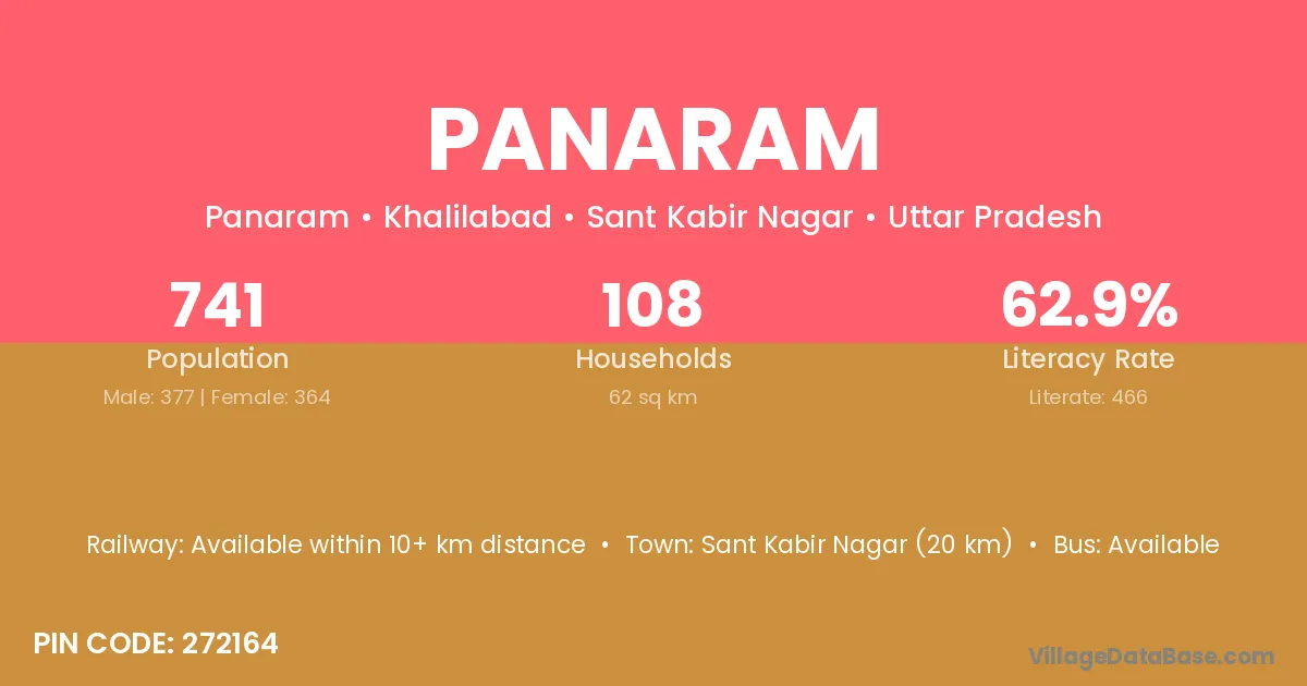 Sant Kabir Nagar (20 km) is the nearest town to Panaram village for major economic activities and is located approximately 20 km away.