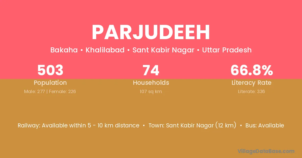 Sant Kabir Nagar (12 km) is the nearest town to Parjudeeh village for major economic activities and is located approximately 12 km away.
