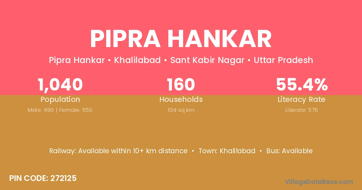 Pipra Hankar village has a total population of 1,040 people, of which 490 are males and 550 are females.