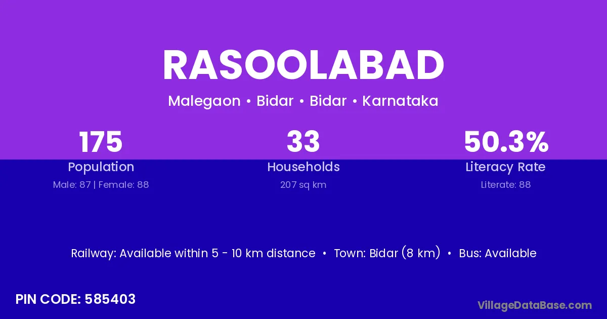 The literacy rate of Rasoolabad village is 60.87%. Male literacy stands at 70.13% and female literacy at 50.14%.
