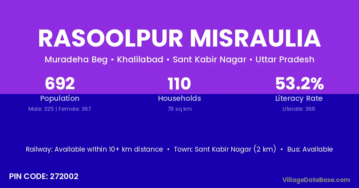 Sant Kabir Nagar (2 km) is the nearest town to Rasoolpur Misraulia village for major economic activities and is located approximately 2 km away.