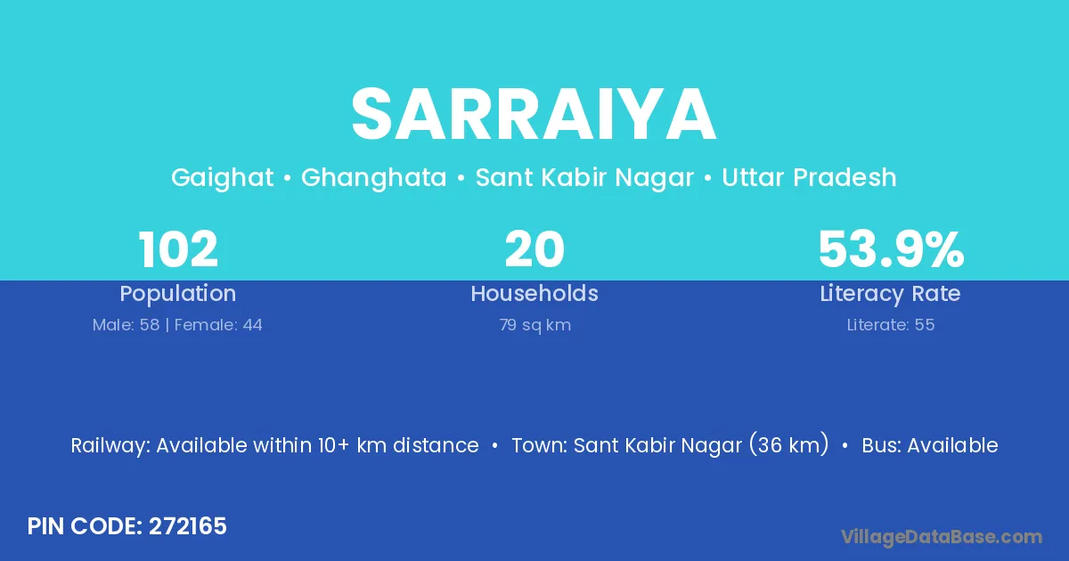 Sant Kabir Nagar (2 km) is the nearest town to Sarraiya village for major economic activities and is located approximately 2 km away.