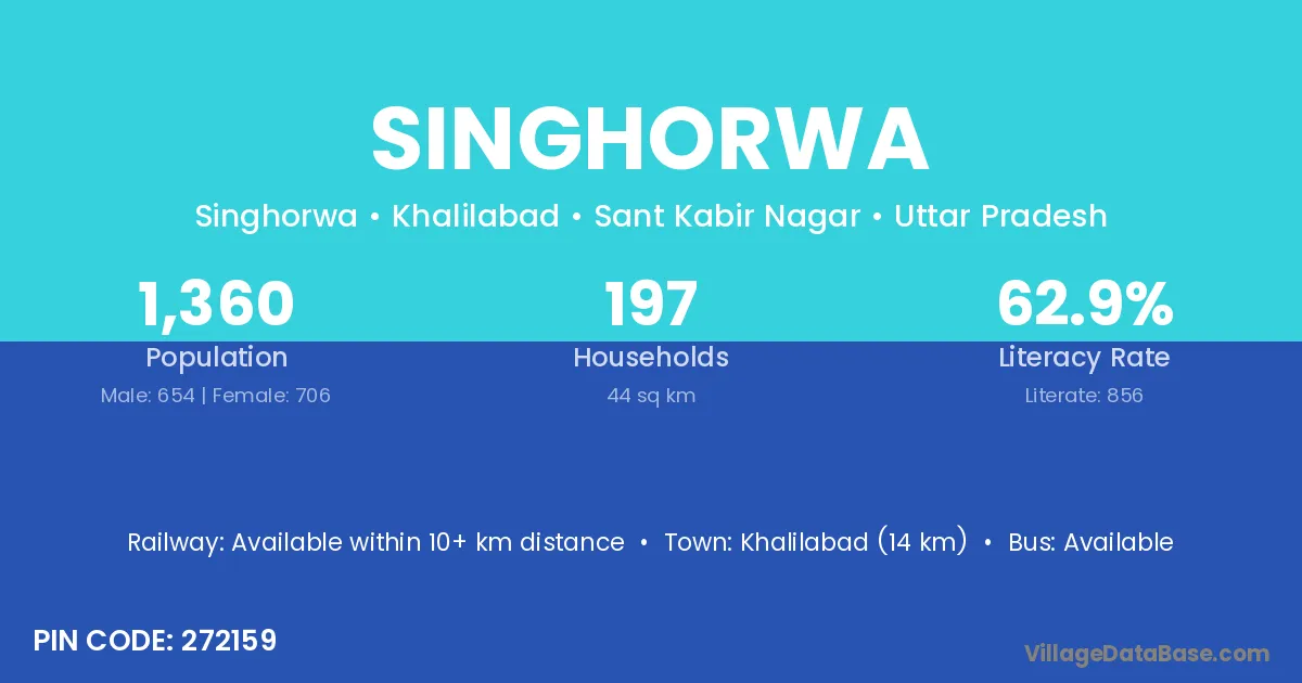 Khalilabad (14 km) is the nearest town to Singhorwa village for major economic activities and is located approximately 14 km away.