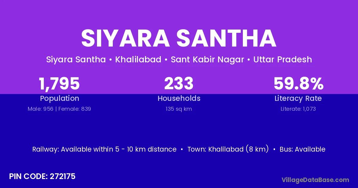 Khalilabad (8 km) is the nearest town to Siyara Santha village for major economic activities and is located approximately 8 km away.