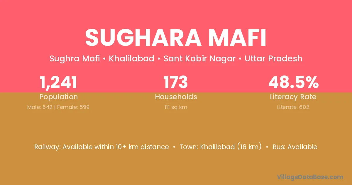 Khalilabad (16 km) is the nearest town to Sughara Mafi village for major economic activities and is located approximately 16 km away.