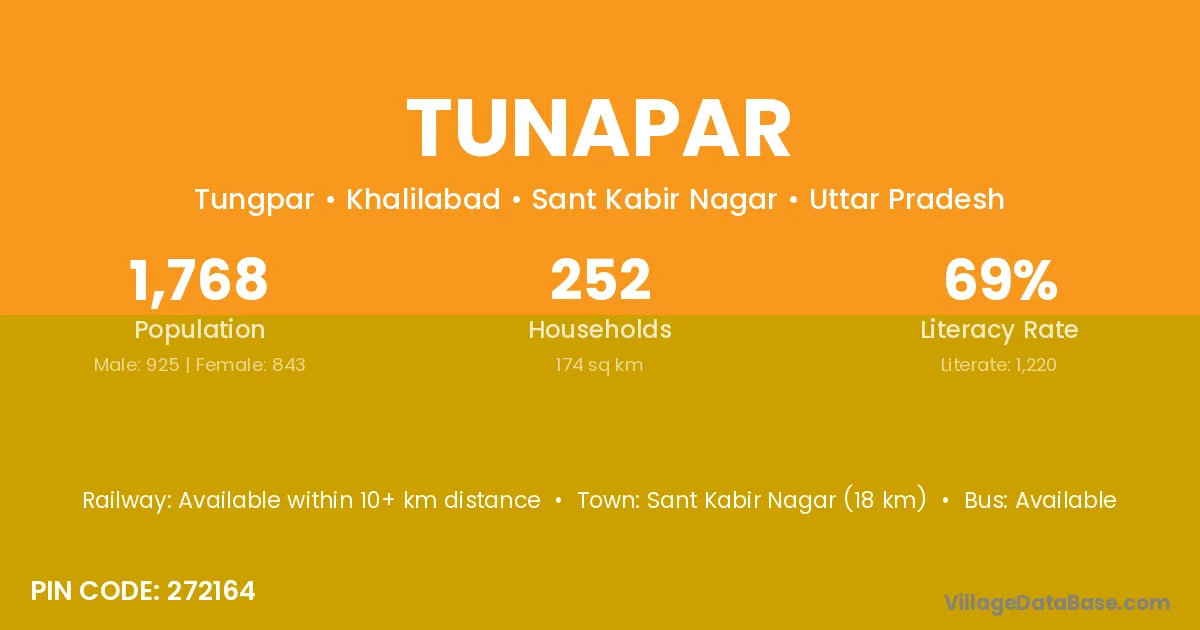 Sant Kabir Nagar (18 km) is the nearest town to Tunapar village for major economic activities and is located approximately 18 km away.