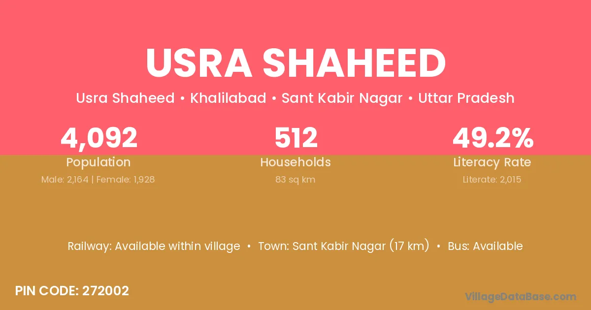Sant Kabir Nagar (17 km) is the nearest town to Usra Shaheed village for major economic activities and is located approximately 17 km away.