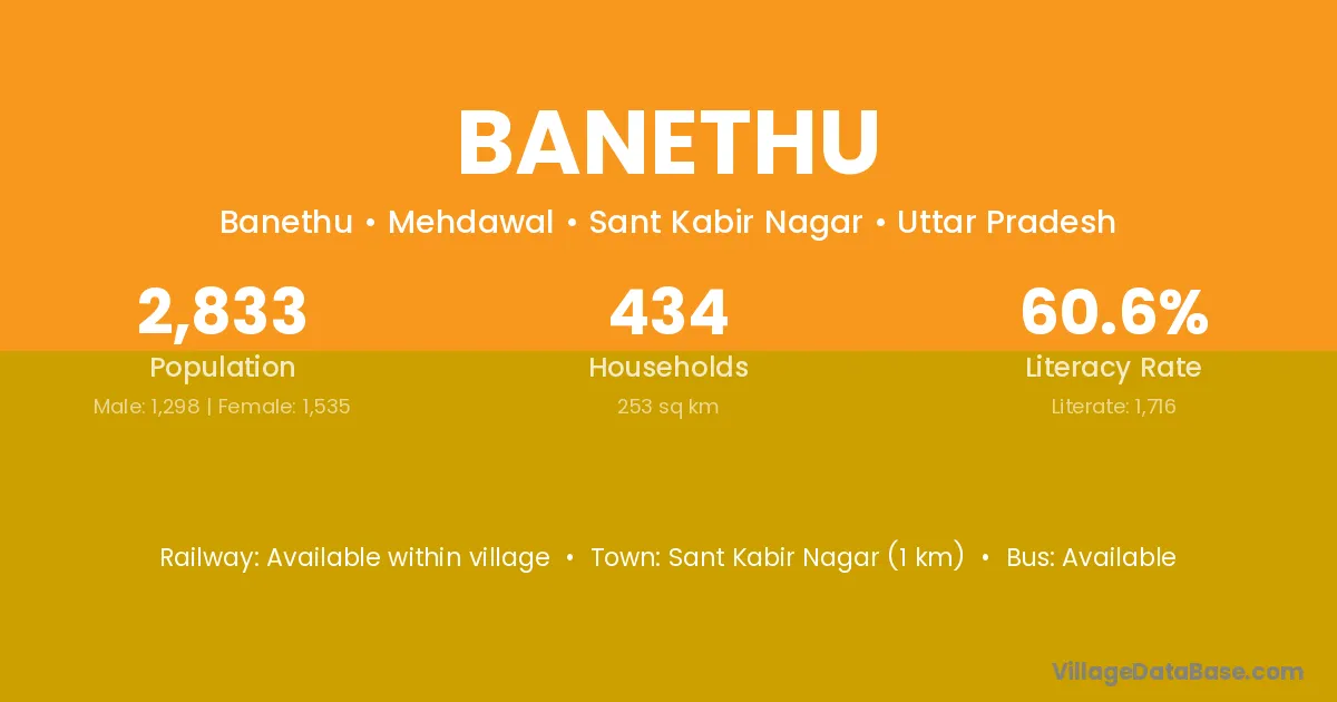 Sant Kabir Nagar (1 km) is the nearest town to Banethu village for major economic activities and is located approximately 1 km away.
