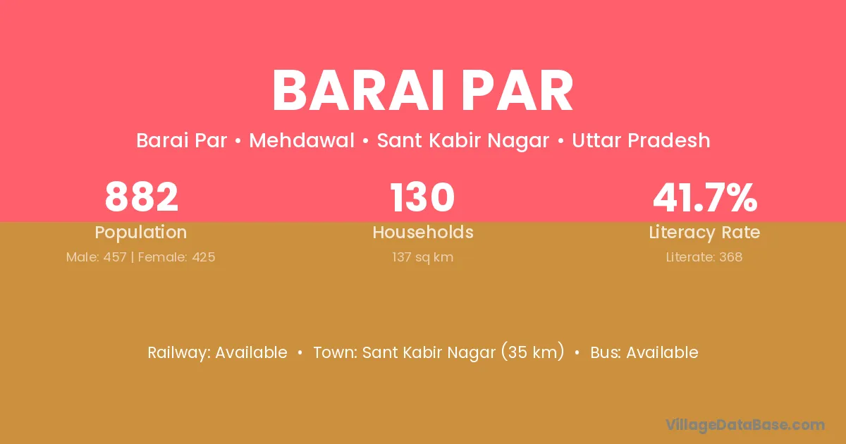 Sant Kabir Nagar (35 km) is the nearest town to Barai Par village for major economic activities and is located approximately 35 km away.