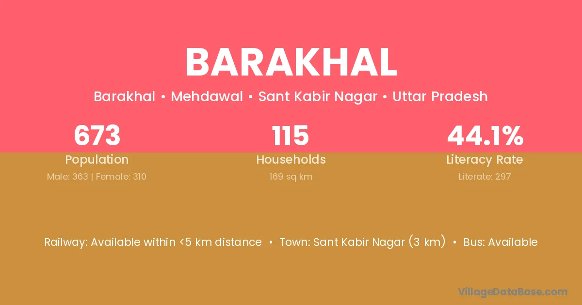 Sant Kabir Nagar (3 km) is the nearest town to Barakhal village for major economic activities and is located approximately 3 km away.