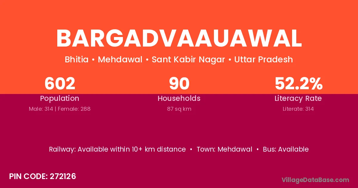 Bargadvaauawal village has a total population of 602 people, of which 314 are males and 288 are females.