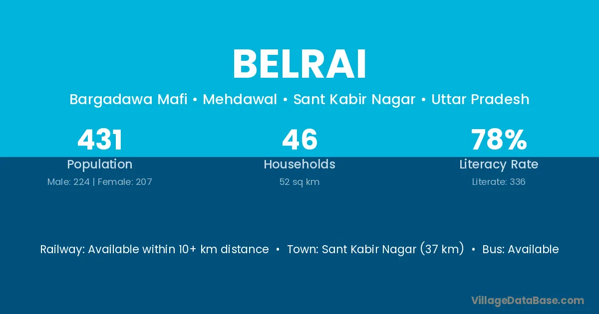 Sant Kabir Nagar (37 km) is the nearest town to Belrai village for major economic activities and is located approximately 37 km away.