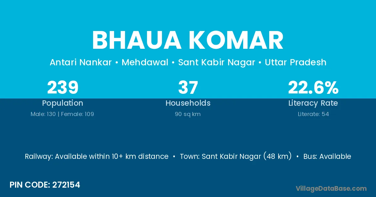 Sant Kabir Nagar (48 km) is the nearest town to Bhaua Komar village for major economic activities and is located approximately 48 km away.