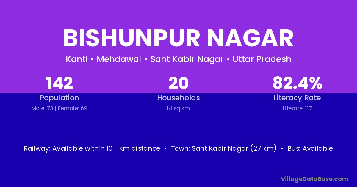 Sant Kabir Nagar (27 km) is the nearest town to Bishunpur Nagar village for major economic activities and is located approximately 27 km away.